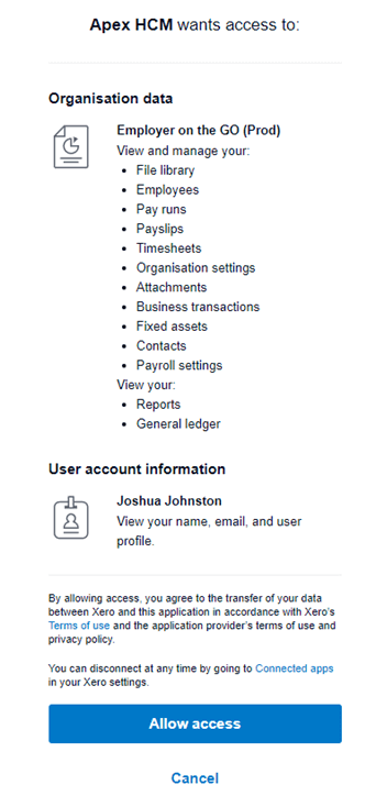 Simply click the “connect to Xero” button, and you will then be directed to the next screen, which will ask you to enter your credentials. After entering your credentials, Xero is going to ask you for permission to share data with Apex HCM. The screen should look like the below.